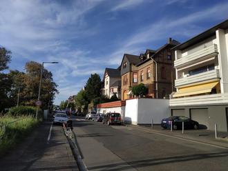 Vorne links auf der Ansichtskarte von 1910 befand sich der schienengleiche Bahnübergang an der Kreuzung Rheinstraße. Dieser wurde 1966 durch eine Straßenbrücke („Überflieger“) und eine Fußgängerunterführung ersetzt, sodass die Bahnhofstraße im abgebildeten Teil heute für den Kraftfahrzeugverkehr keinen direkten Anschluss mehr an den jenseitigen Teil der Bahnhofstraße hat, dafür aber an die Dr. Michel-Straße. Die Häuser mit den Fachwerkgiebeln auf der Bergseite sind noch weitgehend erhalten, wenn auch ohne Türmchen. Hinzu kamen auffällige Neubauten und Garageneinfahrten anstelle der Mauer.
