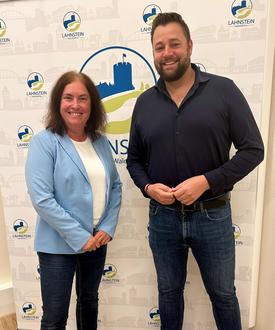 Oberbürgermeister Lennart Siefert heißt die neue Wirtschaftsförderin der Stadt Lahnstein Anja Kriete im Rathaus herzlich willkommen. (Foto: Mira Bind / Stadtverwaltung Lahnstein)
