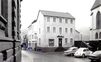 1968: Seit 1900 stand an der Ecke zur Pfarrgasse in Oberlahnstein ein Hotel. Zuletzt wurde dieses von Karl Schmidt als „Rhein-Hotel“ geführt.