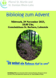 Keine andere Jahreszeit ist so mit Emotionen und Hoffnungen verbunden wie die Adventszeit. “Wir laden Sie ein, die Geschichten in der Adventszeit aus der Bibel neu zu entdeckten und zum Leben zu erwecken. An diesem Abend lassen wir biblische Erzählungen in unser Leben fließen und erspüren den ganz konkreten Bezug zu uns. Die Heilige Schrift kommt somit als tragendes Fundament und Kraftquelle des eigenen Glaubenslebens in den Blick. Probieren Sie es aus und lassen Sie sich auf das Angebot ein. Wir freuen uns auf den Abend mit Ihnen / mit Dir! Wir, dass sind Tanja Kaminski, Gemeindereferentin und Ulrike Schneider, geistliche Leiterin im Kolping Bezirk Rhein-Lahn. Der Bibliolog dauert ungefähr eine Stunde und im Anschluss folgt eine Austauschrunde und bei Glühwein und Gebäck lassen wir den Abend gemütlich ausklingen und stimmen uns ein wenig auf den Advent ein. Teilnehmer*innen, die diese Methode noch nicht kennen, brauchen keine Hemmungen zu haben, vor Beginn wird alles genau beschrieben und erklärt“, so laden die Initiatorinnen der Veranstaltung herzlich ein. Termin: Mittwoch, 28. November 2023,18.00 Uhr, Gemeindehaus St. Barbara, Lahnstein, Johann-Baptist-Ludwig-Str. Anmeldung: Um besser planen zu können, Anmeldung bis 26. November 2023 über das Zentrale Pfarrbüro, Tel.: 02621/628980.