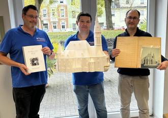 Pascal Nicolas und Bernd Krinninger überreichten Stadtarchivar Bernd Geil das Modell der St. Barbara Kirche.