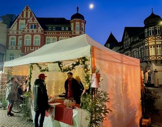 Nur wenige Schritte weiter entsteht in der Rödergasse rund um den historischen Brunnen der stimmungsvolle Altstadt-Zauber mit einer vielfältigen Auswahl an nachhaltig hergestellten Produkten von kreativen Upcycling-Dekorationen über Liköre, Plätzchen und Stollen bis zu Essig, Duschgel und weihnachtlichen Dekoartikeln. Glühwein, Kaffee, Kinderpunsch, frisch gebackene Waffeln, Zuckerwatte, heiße Maronen und Popcorn sorgen zudem für das leibliche Wohl. An beiden Tagen findet jeweils um 16.00 Uhr ein gemeinsames Weihnachtssingen statt.
