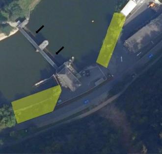 Wasserkraftwerk Lahnstein mit Flächen, in denen die Gehölz- rückschnittarbeiten erfolgen sollen (grün unterlegt). (Bild: WSV.de)
