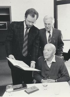 Willi Rasel (sitzend) wird von Rudolf Scharping und Willi Klein zum 90. Geburtstag gratuliert (Foto: Erwin Pollak, 1990)