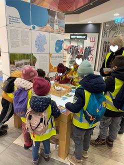 Im Einkaufszentrum erwartete die Kinder eine ganz besondere Entdeckung: Die Ausstellung „Wasser des Lebens“, die auf spielerische Weise alles rund um das Thema Trinkwasser erklärte. Neugierig und voller Entdeckungsdrang erkundeten die Kinder die verschiedenen Stationen der Ausstellung und erfuhren viel über die Bedeutung von Wasser in unserem Alltag und wie wichtig das Trinken von Wasser bei Hitze und Sport ist.