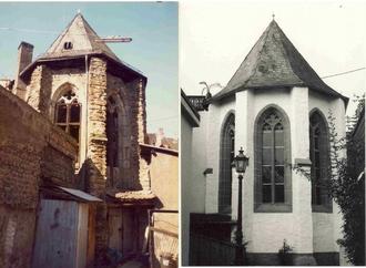 Der Chor der Kapelle aus der Altgasse betrachtet, vor der Renovierung 1981 und heute (Fotos: Willi Eisenbarth)