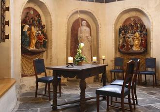 Innenansicht mit der Jakobusstaue und den beiden Reliefs des Sakramentsaltars (Foto: Berthold Schaus)