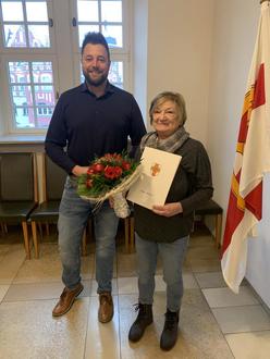 Renate Ipek (Fachbereich 3) wurde für ihr 25-jähriges Dienstjubiläum geehrt. Seit 25 Jahren arbeitet sie in der betreuenden Grundschule in der Schillerschule und Fachbereichsleiterin Sybil Sasse sprach ihr ihre Anerkennung für die tägliche Arbeit mit über 20 Kindern aus, die eine Herausforderung und besondere Leistung zugleich sei.