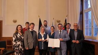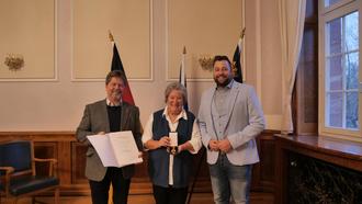 Auch Lahnsteins Oberbürgermeister Lennart Siefert (r.) freute sich mit Ulrike Baum (M.) und ihrem Ehemann Wolfgang Baum (l.) über die Auszeichnung.