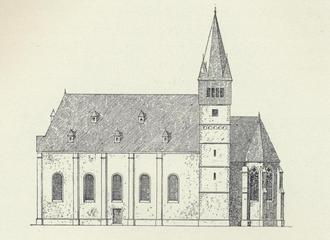 Südansicht nach Anbau des Kirchenschiffs und Aufstockung des Südturms, 1900