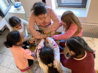 Noch ist Winter. Die Schulbienen haben sich in ihrem Stock zurückgezogen. Um den kalten Winter zu überstehen, bilden sie die sogenannte Wintertraube. Darin sitzen die Bienen sehr eng beieinander und halten sich gegenseitig warm. Im Inneren der Traube sitzt die Königin. Die Kinder der Bienen AG dagegen sind zur Zeit sehr aktiv. Im Moment werden Rähmchen gesäubert und neu eingedrahtet, Beuten gestrichen, alte und leere Waben zu Wachs geschmolzen und damit neue Mittelwände gegossen. Warum? Um den fleißigen Bienen einen guten Start in den Frühling zu ermöglichen. Denn dann geht es wieder los mit Pollen und Nektar sammeln und Honig produzieren.
