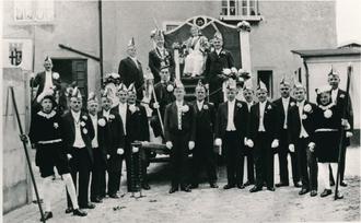 Die Aktiven der Niederlahnsteiner Karnevalsgesellschaft 1911 vor dem Jubiläumswagen bei der ersten Kappenfahrt 1936 mit Erdbeerkönigin.