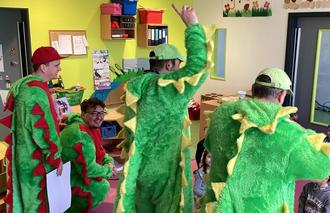 Passend zur Karnevalszeit bekamen die Kinder der Kita EinSteinchen einen ganz besonderen Besuch. Mit lauten Helau - Rufen und mit Süßigkeiten bewaffnet, stürmten vier Dinosaurier den Kindergarten.