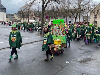 „Als Frösche hüpfen wir durchs Land, als „Jeck“ ist die Kita Allerheiligenberg bekannt“, unter diesem Motto hüpften mehr als 100 Frösche fröhlich und mit gut gefüllten Kamelle Beuteln durch den Lahnsteiner Kinderkarnevalsumzug.