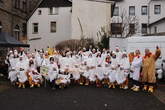 Trotz des Regenwetters war die Freude und Begeisterung der Kita LahnEggs beim diesjährigen Lahnsteiner Kinder- und Jugendumzug groß. Als Hühner verkleidet trafen sich Eltern, Kinder und ErzieherInnen bereits vor dem Umzug zum Schminken und Schmücken der Bollerwagen in der Kita, um sich mit karnevalistischer Musik gemeinsam einzustimmen. Mit ca. 150 Personen ging es in Richtung Marktplatz, wo man voller Vorfreude auf den Einsatz wartete. Mit samt eigener Kapelle ging es um 14 Uhr los in Richtung Salhofplatz. Die Kinder warfen eifrig und voller Spaß Kamelle begleitet von einem lauten „Helau“.