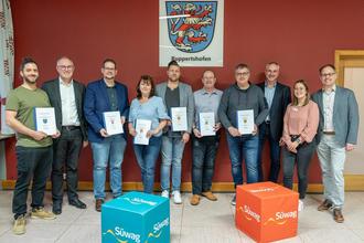 (von links): Nach der Vertragsunterzeichnung im Dorfgemeinschaftshaus Ruppertshofen: Simon Ohlemacher (Beigeordneter der Ortsgemeinde Holzhausen), Jouke Landman (Süwag), André Stötzer (Ortsbürgermeister Miehlen), Peggy Breitenbach (Ortsbürgermeisterin Niederwallmenach), Andy Leicht (Ortsbürgermeister Oberwallmenach), Jan Menzel (Ortsbürgermeister Buch), Jens Gilles (Ortsbürgermeister Lautert), Marc Ringelstein (Süwag), Jessica Heuser (VG Nastätten) sowie Jens Güllering (Bürgermeister der VG Nastätten). Auf dem Foto fehlt Marco Ludwig, Stadtbürgermeister von Nastätten.