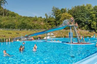 Die beliebte Rutsche und der Sprungturm (im Hintergrund) sorgen auch in der Badesaison 2023 für den nötigen Spaß für „Jung und Alt“ im Waldschwimmbad Nastätten