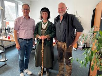 Revierleiter Martin Janner, Laura in ihrer Handwerkskleidung und Bürgermeister Jens Güllering (von rechts) beim Besuch in der Nastätter Verwaltung
