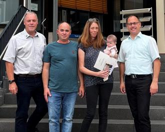Sichtlich erfreut nahmen die Eltern der kleinen Alea die Ehrung entgegen. Bürgermeister Jens Güllering und Ortsbürgermeister Stefan Wöll nutzten gerne die Gelegenheit, um mit Familie Müller über die Familienfreundlichkeit und die Lebensbedingungen im Blauen Ländchen zu sprechen. Die zahlreichen Vereinsaktivitäten, das Schwimmbad und die Mitgliedschaft in der Freiwilligen Feuerwehr wurden hierbei beispielhaft als sehr positiv bewertet.