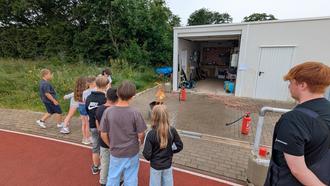 Im Anschluss durchliefen die Schülerinnen und Schüler in Kleingruppen sechs abwechslungsreiche Stationen: Vom richtigen Verhalten im Brandfall über faszinierende Experimente zum Verbrennungsdreieck bis zur Handhabung von Feuerlöschern und dem Einsatz hydraulischer Rettungsgeräte war alles dabei. Auch der Teamkran forderte das gemeinsame Geschick der jungen Teilnehmer.