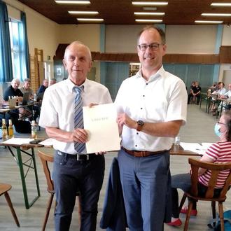 1. Beigeordneter Ernst-Georg Peiter (links) bei der Übergabe der Ernennungsurkunde an Bürgermeister Jens Güllering. Die Ernennung fand im Rahmen der öffentlichen Sitzung des Verbandsgemeinderates am 30.6. in Himmighofen statt