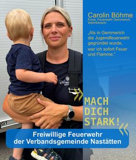 Carolin ist seit über 25 Jahren Teil der Feuerwehr. Ihre Laufbahn begann 1999 mit der Gründung der Jugendfeuerwehr Gemmerich. Seit 2004 ist sie aktives Mitglied - heute trägt sie den Dienstgrad Brandmeisterin und ist Wehrführerin sowie stellvertretende Jugendwartin.