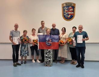 Als kleines Dankeschön überreichte Nadine Bärz allen vieren eine Urkunde mit einem Gutschein, ein mit dem Gemeindewappen graviertes Glas und eine Flagge mit dem Hainauer Wappen. Die Partnerinnen der Geehrten erhielten einen Strauß Blumen.