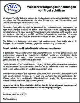 Mit dieser Veröffentlichung weisen die Verbandsgemeindewerke Nastätten darauf