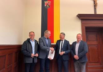 Schiedsmann Jan Menzel, Amtsgerichtsdirektor Ludger Griesar, der neue stellvertretende Schiedsmann Frank Link und Bürgermeister Jens Güllering (von rechts) bei der Ernennung im historischen Sitzungssaal des Amtsgerichtes Lahnstein.
