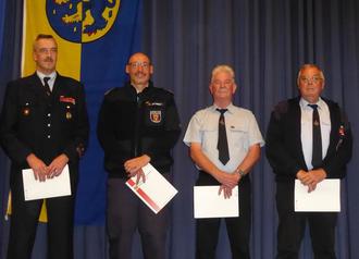 Für ihre herausragenden Leistungen im Dienst der Feuerwehr wurden Markus Breithaupt und Carsten Schmidt mit der goldenen Ordensspange und Dieter Alberti sowie Dieter Simon mit der bronzenen Ordensspange des Kreisfeuerwehrverbandes ausgezeichnet.