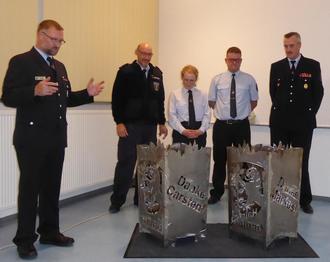 Als Abschiedsgeschenk bekamen die beiden Geehrten jeweils eine speziell angefertigte Feuertonne überreicht.