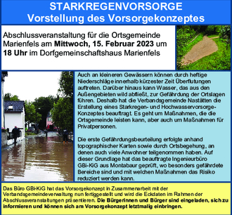 Abschlussveranstaltung für die Ortsgemeinde Marienfels am Mittwoch, 15. Februar 2023 um 18 Uhr im Dorfgemeinschaftshaus Marienfels