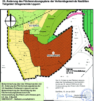 Die Verbandsgemeinde Nastätten möchte die ehrgeizigen Ziele der Europäischen Union und der Bundesrepublik Deutschland mit vorantreiben sieht daher eine 20. Änderung des Flächennutzungsplans (FNP) im Parallelverfahren zur Aufstellung des Bebauungsplans „PV-Freiflächenanlage Lipporn“ in der Ortsgemeinde Lipporn vor. Ziel ist die Baurechtschaffung für eine großflächige Photovoltaik-Freiflächenanlage (PV-FFA) im Teilgebiet der Ortsgemeinde Lipporn.