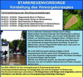| Terminankündigung der Abschlussveranstaltungen 08.03.23 18:30Uhr Ortsgemeinde Buch im Rathaus 09.03.23 18:30Uhr Ortsgemeinde Hainau im Gemeindehaus 14.03.23 18:30Uhr Stadt Nastätten im Bürgerhaus 21.03.23 18:00Uhr Ortsgemeinde Niederbachheim im Gemeindehaus 28.03.23 18:30Uhr Ortsgemeinde Diethardt im Gemeindehaus | ||
