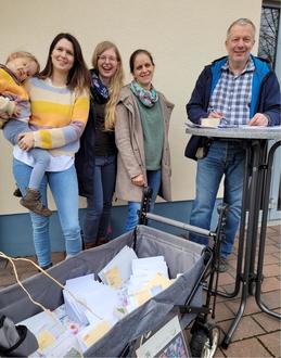 Gemeinsam mit Vertreterinnen des Vereins Wald und Wiese e. V. wurden anlässlich des Kindergartenbasars vorbereitete Saatgutpäckchen an interessierte Bürgerinnen und Bürger ausgegeben.