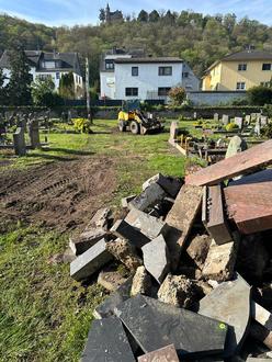 Ende April war der Bauhof der Verbandsgemeinde mehrere Tage mit schwerem Gerät auf unserem Friedhof im Einsatz. Der Auftrag der Ortsgemeinde Osterspai lautete: Abräumen der verbliebenen sieben Grabstätten und Beseitigung von Restfundamenten auf Grabfeld 5.