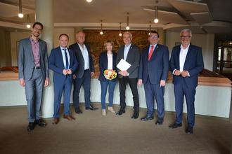 v.l.n.r. MdL Manuel Liguori, Bürgermeister Mike Weiland, Beigeordneter der Stadt Kaub Uwe Bernd, Gattin Marita Dillenberger, Jörg Dillenberger, Landrat Jörg Denninghoff und MdL Roger Lewentz. Foto: Saskia Daubach-Metz / Kreisverwaltung Rhein-Lahn.