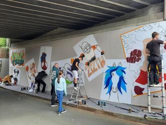 Am 17. und 18.05. ging es dann direkt an die Gestaltung der Unterführung. Zunächst wurde der Hintergrund gerollt und die TeilnehmerInnen machten sich mit der Sprühdose und den verschiedenen Aufsätzen vertraut. Hierzu stand eine Holzplatte bereit, auf der die Jugendlichen sich probieren konnten. Dann wurden die jeweiligen Blätter bzw. Skizzen der jungen KünstlerInnen selbstständig mit Farbe gefüllt und gestaltet. Die Freude am Sprühen war nicht nur bei den teilnehmenden Jugendlichen sehr groß. Während der gesamten Aktion kamen immer wieder interessierte ZuschauerInnen vorbei, die das Geschehen verfolgten und sich an der Neugestaltung der Wände erfreuten. Alle Reaktionen auf den Workshop waren durchweg sehr positiv. Die zuvor graue, triste Unterführung wurde zu einem echten Hingucker, die mit ihren leuchtenden Farben und bunten Figuren jetzt förmlich dazu einlädt, sie zu durchqueren!
