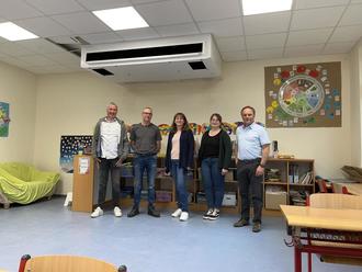 von links Bauamtsleiter Gerd Schuster, Sachbearbeiter Hochbau Arnd Klein, Schulleiterin Ulrike Günter, Carolin Struth von der Firma Melzer und Bürgermeister Mike Weiland vor einem bereits eingebauten Lüftungsgerät.