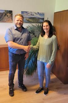 Der Beigeordnete der Verbandsgemeinde Loreley Marco Jost begrüßte die neue Kollegin Jasmin Müller an ihrem ersten Arbeitstag. Foto: Marvin Gollnow / VG Loreley