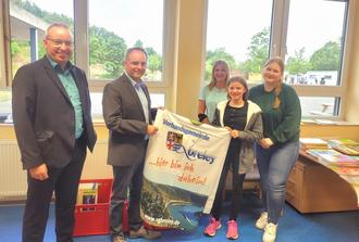 v.l.n.r. Schulleiter Christian Schüler, Bürgermeister Mike Weiland, Verwaltungsmitarbeiterin Nadine Hehner, Carolina Hehner und die Auszubildende Lara Bröder beim kurzen Besuch bei der Schulbuchausleihe an der Loreleyschule. Passend zum Hobby von Carolina, dem Leistungsschwimmen, überreichte Bürgermeister u.a. ein Multifunktionshandtuch der Verbandsgemeinde Loreley. Foto: VG Loreley