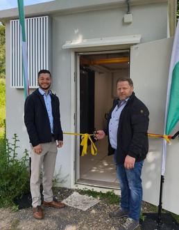 Dennis Drechsler, Regional Deployment Manager bei UGG, für die Projektbegleitung und Ortsbürgermeister Marco Jost beim symbolischen Startschuss vor dem Gebäude des Hauptverteilers an der Gemeindehalle. Für die fortlaufende unermüdliche Unterstützung zur Umsetzung des Projektes dankte Herr Drechsler der Ortsgemeinde Dahlheim.