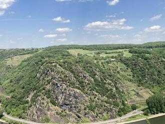 Diesen Blick hatten die Vertreter:innen der UNESCO bei ihrem Besuch im Mai 2022. Die Sommerrodelbahn lässt sich von hier aus höchstens erahnen, sodass sich jede/r selbst eine Meinung darüber bilden kann, ob hier von einer Störung des Landschaftsbildes gesprochen werden kann.