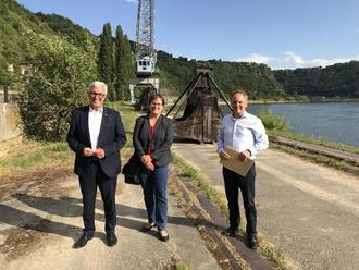 V. l. n. r. Innenminister Roger Lewentz, Generaldirektorin Dr. Heike Otto und Bürgermeister Mike Weiland vor dem denkmalgeschützten Krangelände am Rhein in St. Goarshausen.
