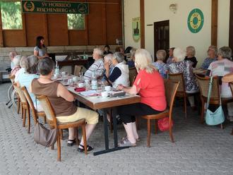 Die Gäste sangen unter Begleitung der Organistin Miko Imai verschiedene bekannte Lieder. Die Gemeindeschwester+, Yvonne Weiland, erläuterte Ihr Angebot und stellte insbesondere die Notfallbox und eine Broschüre zum Thema Vorsorge vor. Dafür wurden vor Ort gleich zahlreiche Bestellungen entgegengenommen. Wer nicht beim Kaffee dabei war, kann beides gerne über die Gesamtkirchengemeinde oder die Gemeinde bestellen. Natürlich gab es auch Kaffee und Kuchen, der allen gut geschmeckt hat. Wasser fand wegen der Temperatur ebenfalls reißenden Absatz. Pfarrer Pohl thematisierte in seinem Impuls die Zeit: Was gestern war, ist nicht mehr zu ändern, was morgen sein wird, wissen wir noch nicht, also leben wir froh und guten Mutes den heutigen Tag. Zum Schluss waren sich alle einig, dass es schön war, nach den Coronabedingten Ausfällen wieder einmal gemütlich zusammenzusitzen und sich in gemütlicher Runde auszutauschen.