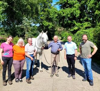 Der Araberhengst zeigt sich in traditionellen Zaumzeug mit dem Team des Arabergestüts Kauber Platte und Bürgermeister Mike Weiland. Foto: Marvin Gollnow / VG Loreley.