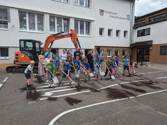 Natürlich durften die Kinder den symbolischen Spatenstich zur Sanierung des Schulhofes der Grundschule Kamp-Bornhofen übernehmen. Foto: Jan-Hendrik Clasen / VG Loreley