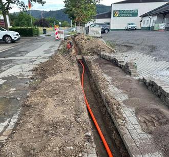 Wie bereits angekündigt, hat vergangene Woche die Deutsche Telekom mit den Anschlussarbeiten zur Glasfaserversorgung der Grundschule im nicht bebauten Bereich begonnen. Hierbei wurde die Leitung neben dem asphaltierten Bereich in den Straßengraben verlegt. Im bebauten Bereich übernimmt dann die von der Deutsche Glasfaser beauftragte Firma Egnatia wieder. Dadurch muss der Abschnitt zwischen Filsener Straße 1 und 25 erneut aufgerissen und diesmal zusätzlich mit einer Telekom Glasfaser Leitung verlegt werden. Denn unmittelbar an der Ecke Filsener Straße/In der Ruth befindet sich der Telekom Verteilerkasten. Dies soll mit den weiteren Arbeiten in der Filsener Straße ab KW 34 erfolgen.