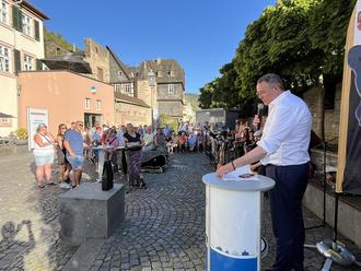 Und genau das zeichnete sich bei bestem Sommerwetter unter freiem Abendhimmel jetzt auf dem Kauber Zollplatz unmittelbar vor der Rheinsteig-Jugendherberge ab: Bei Musik von ‚Take 1 Music‘ und kühlen Getränken, organisiert durch den Förderverein der Freiwilligen Feuerwehr Kaub, gab es, unterstützt durch die Jugendherberge und die Stadt um Stadtbürgermeister Bernd Vogt, ein Forum für Bürgerinnen und Bürger, Ehrenamt und Unternehmen, die nach einem Impuls durch den Ministerpräsidenten auch unmittelbar mit ihm ins persönliche Gespräch und den Austausch treten konnten.