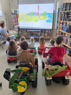 Gespannt verfolgten sie die Geschichten von der Kuh Lieselotte, die so gerne auch einmal Urlaub machen wollte und vom Bauer Beck. Dieser packte kurzer Hand alle seine Tiere auf den Traktoranhänger und fuhr nach Norden ans Meer, um dann letztendlich doch „Ferien auf dem Bauernhof“ zu machen.